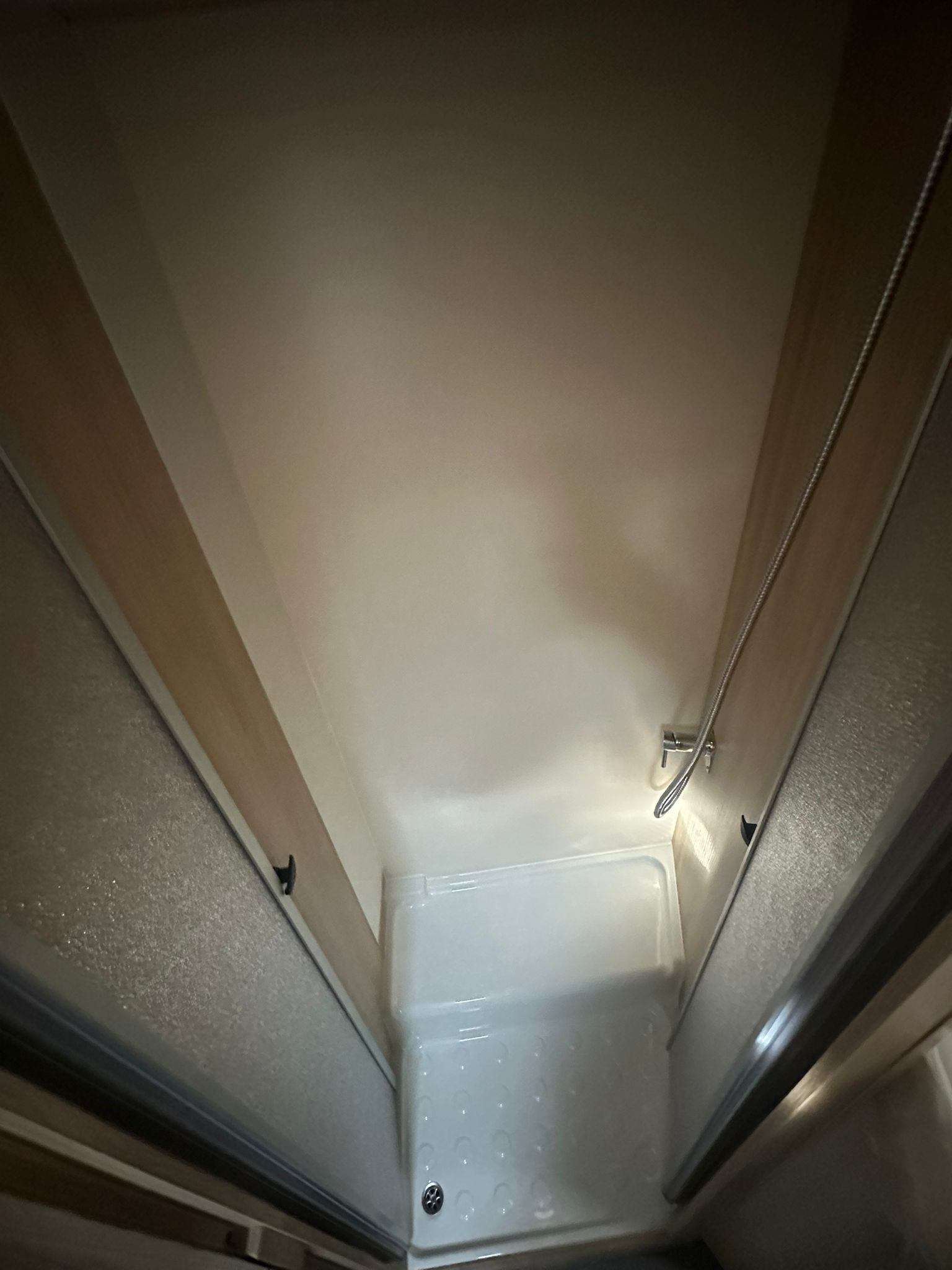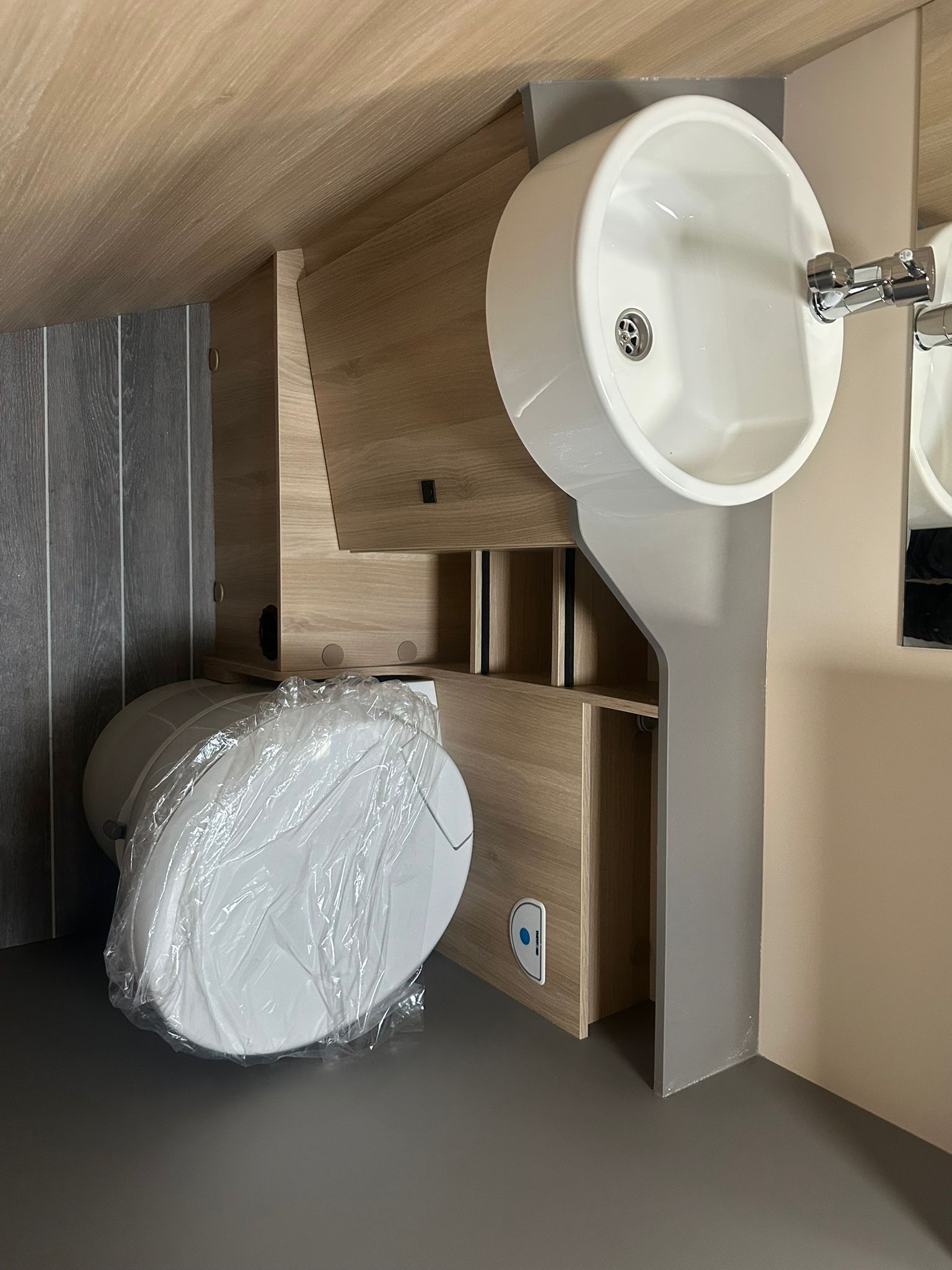 Wygodna łazienka z WC i umywalką po jednej stronie i prysznicem po drugiej stronie. Drzwi od łazienki są dwufunkcyjne dzięki czemu można zamknąć strefę dzienną od nocnej.